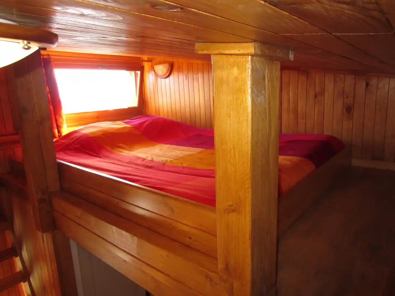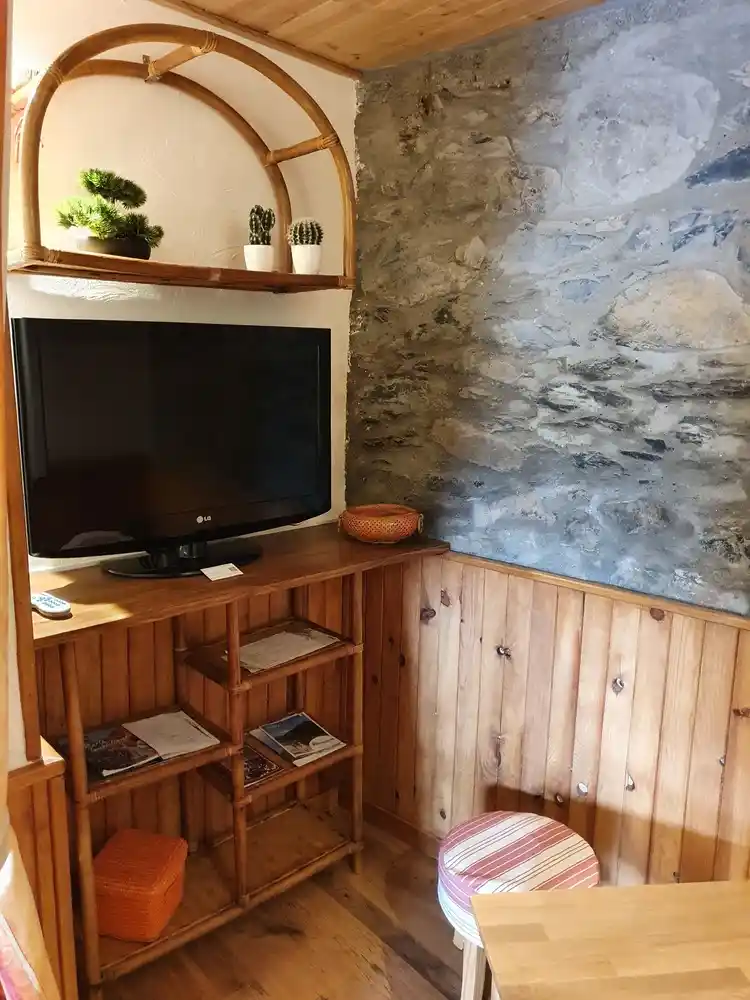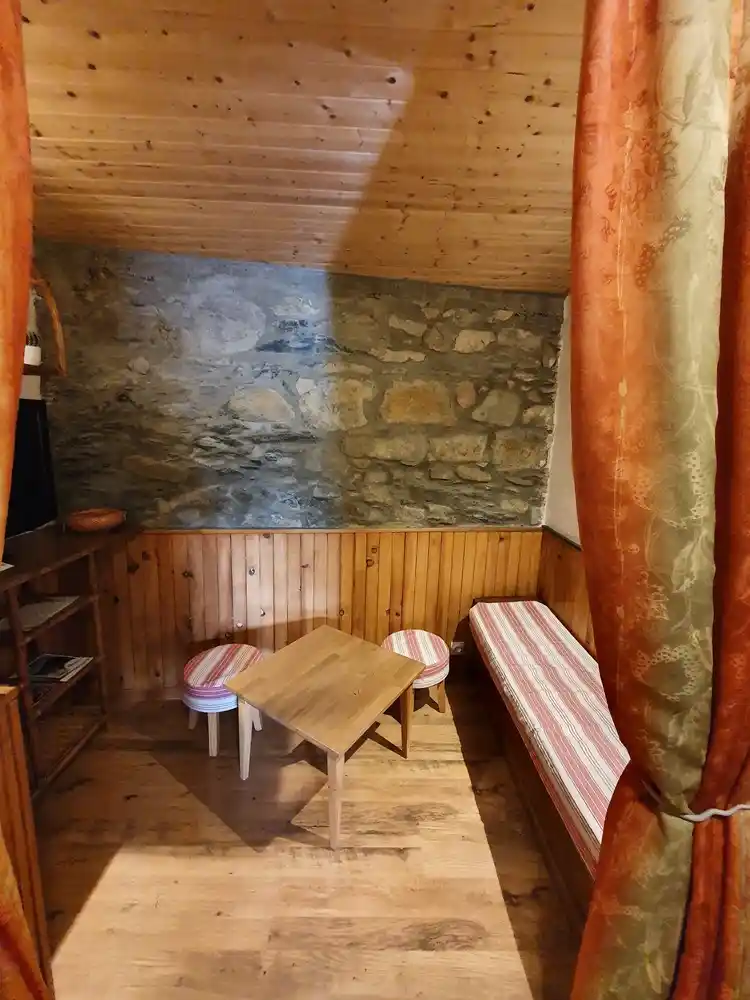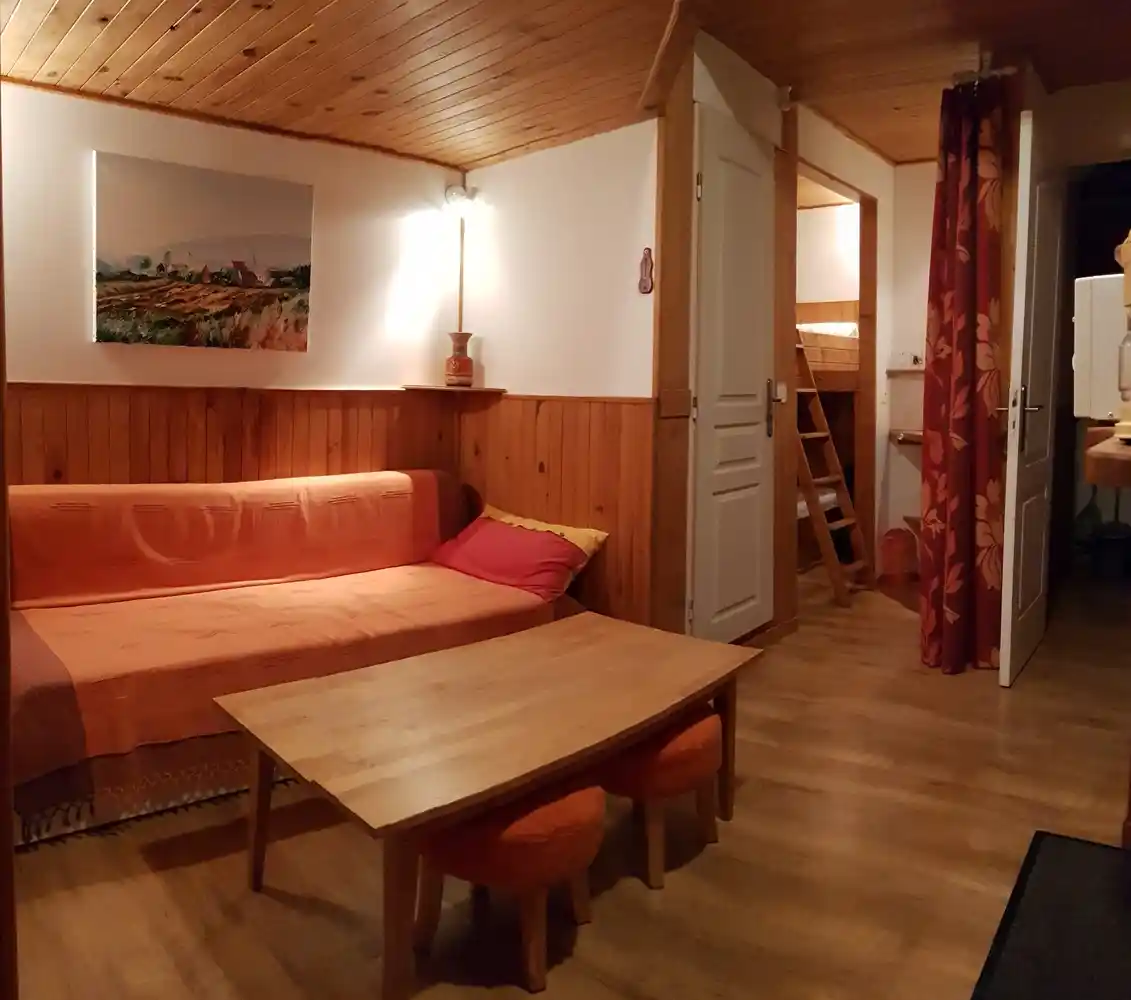 1 salon à l’entrée équipé d’un canapé, avec au dessus 1 lit double en 160 x 200 perché en mezzanine.